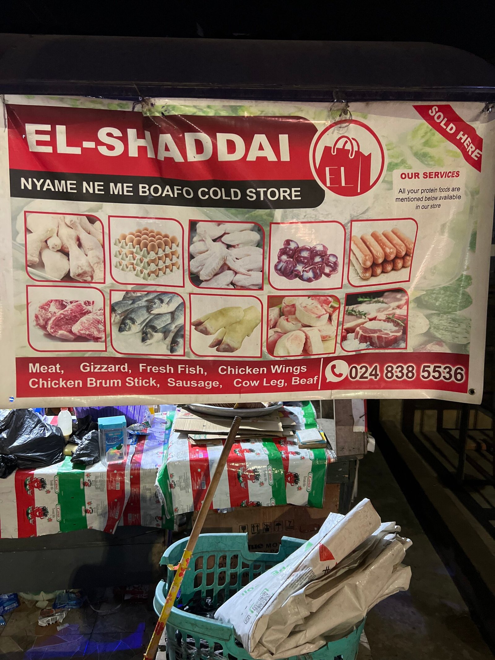 Meat, gizzard, fresh fish, chicken wings, chicken brum stick, sausage, cow leg, beef.